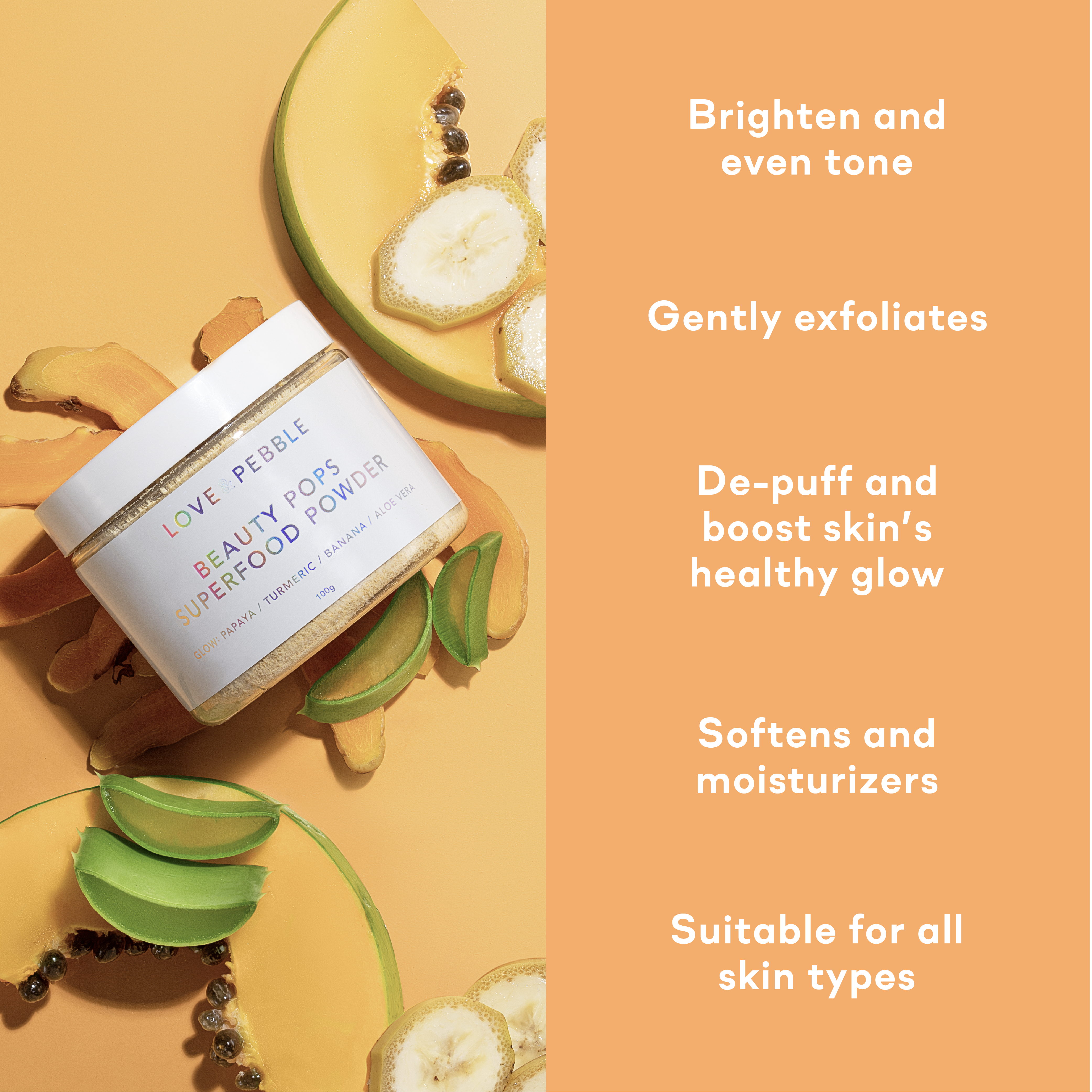 Papaya is a natural fruit enzyme that exfoliates dead skin and dissolves sebum. This deep cleans pores and increases cell turnover to brighten your complexion and lighten dark spots.